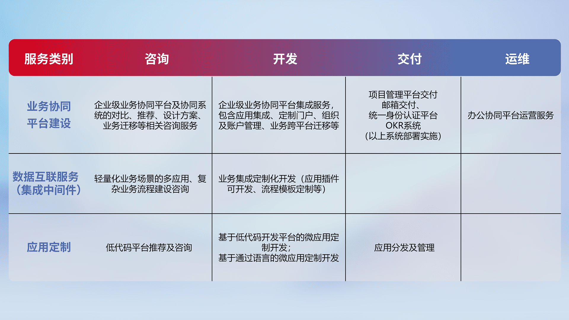 针对钉钉、、、企微、、IDaas等平台级产品提供产品的规划、、方案、、、交付、、定制化开发等服务,,,,实现如统一协同办公、、、智能客户服务、、、混合会议管理、、、、智能数据查询、、、等业务场景,,,,实现数字化转型。。